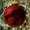 Description: red ball ornament with the thundercats symbol encircled by the code of Thundera: Justice Truth Honor Loyalty